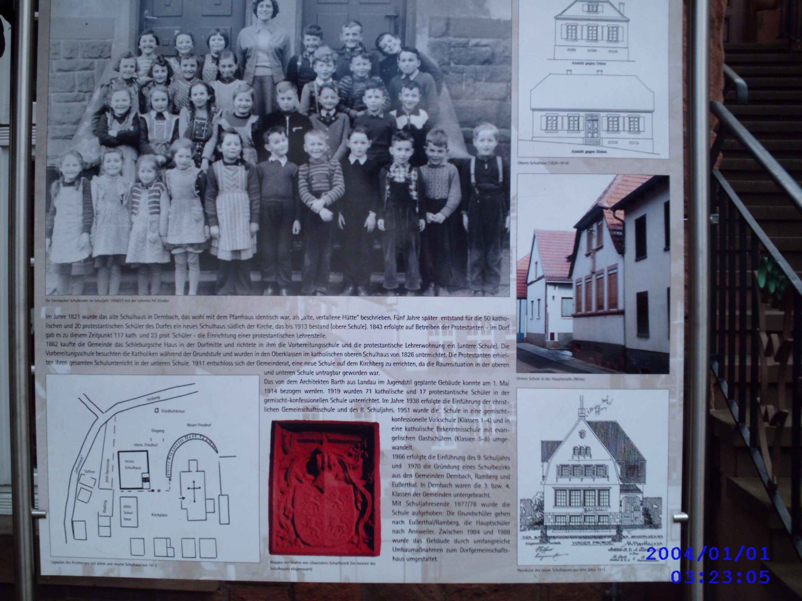 Im Jahre 1821 wurde das alte Schulhaus in Dernbach, das wohl mit dem Pfarrhaus identisch war, als „alte, verfallene Hütte“ beschrieben. Fünf Jahre später  entstand für die 50 katholischen und 20 protestantischen Schüler des Dorfes ein neues Schulhaus südlich der Kirche, das bis 1913 bestand (obere Schule).